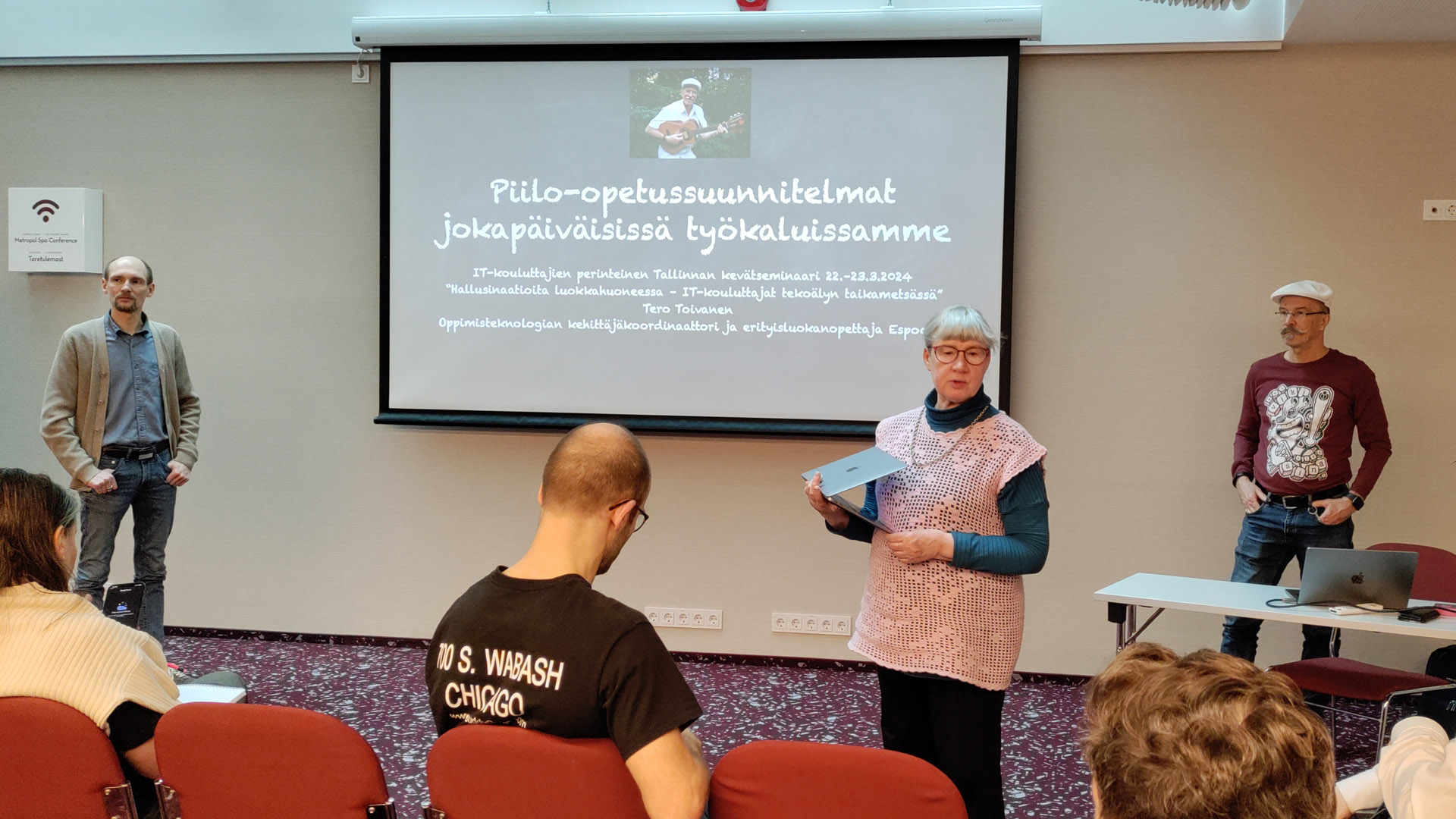 Tero Toivanen kertoo, miten käyttämämme työkalujen piilossa olevat oppimiskäsitykset ja arvovalinnat vaikuttavat opetuksen käytäntöihin hienovaraisesti, meidän huomaamattamme. Eija Kalliala ja Tarmo Toikkanen mukana keskustelussa yleisön kanssa. Kuva: Reidar Wasenius.