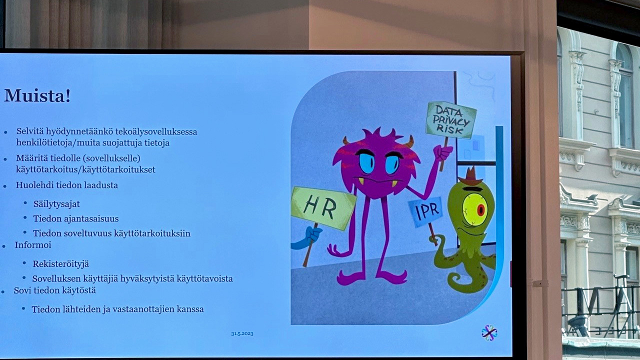 Juttu jatkuu kuvien jälkeen.Tekijänoikeuksien näkökulmasta tekoäly on täysin vastuuton. Kaikki löytyvä aineisto on tekoälyn käytettävissä ja tekoälyn käyttäjä voi jäädä ilman tietoa lähteen tekijänoikeusrajoituksista. Tämän vuoksi tekoälyn tuottama teksti on hyvä pohja, jota kannattaa itse jalostaa omaan käyttöön, sillä vastuu lopputuloksesta on aina tekoälyn käyttäjällä. Pohdittavaksi jää, että mikä on tiedon laatu, jos internet täyttyy enimmäkseen tekoälyn tuottamasta sisällöstä?