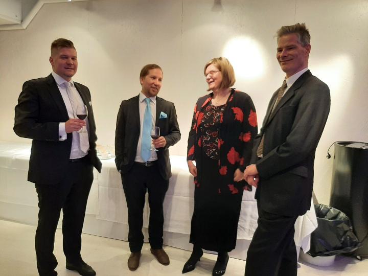 Juhlaväkeä: Juha Lappi, Joona Haavisto, Minna Oksanen ja Mitro Kivinen.